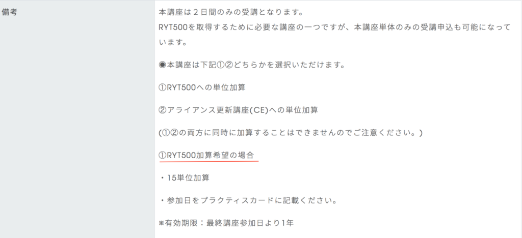 ・「RYT500選択科目」と記載があります。こちらは、①RYT500への単位加算ができる講座のことです。