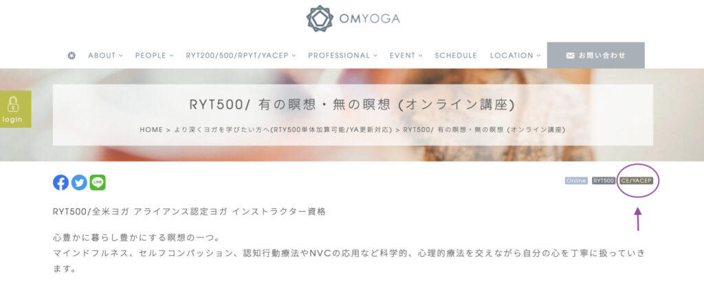 HPの各講座詳細ページ、講座タイトル下に丸で囲ってある「CE/YACEP」のバッジがついている講座がCE対応の講座です。
